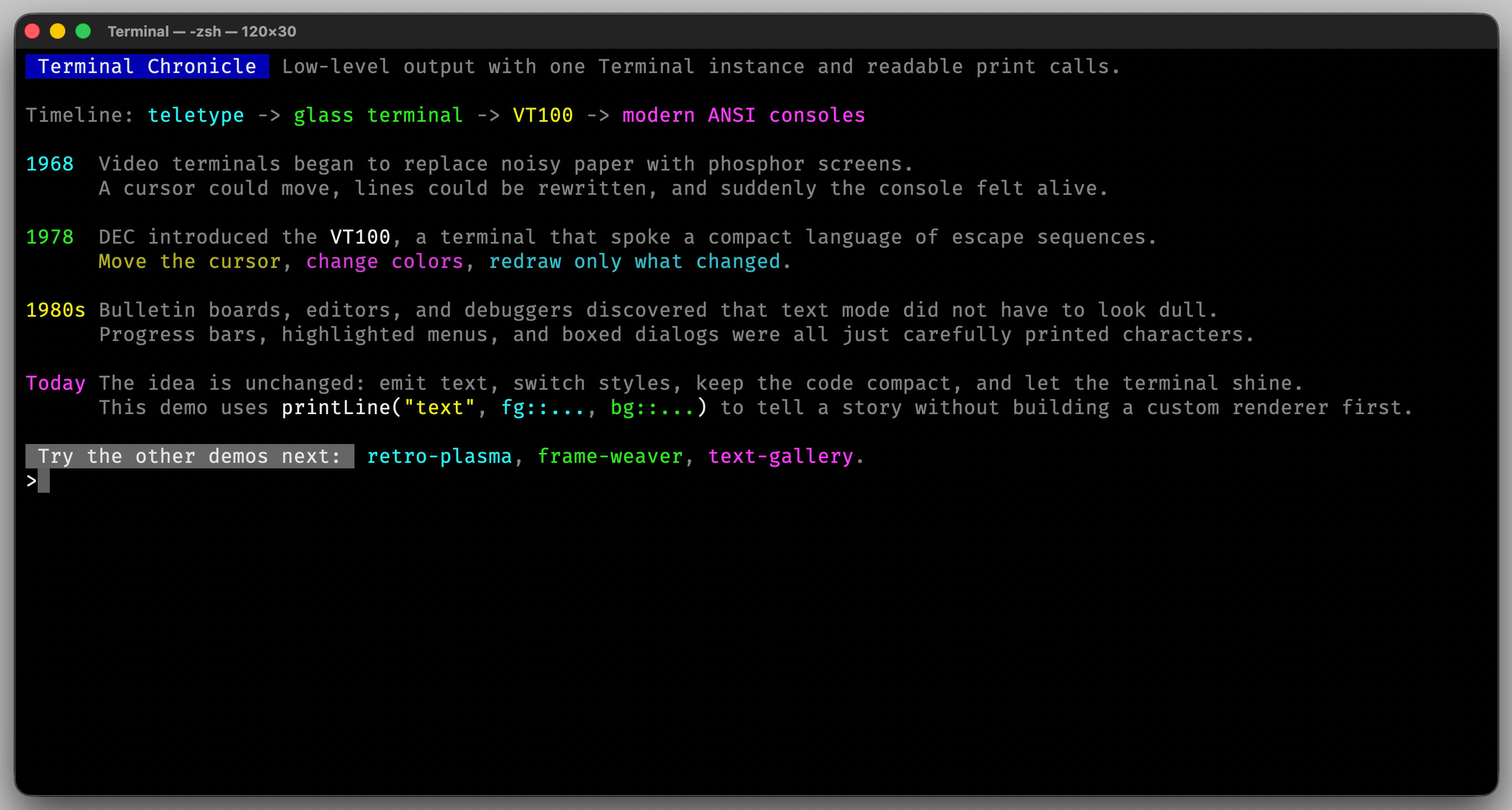 The library provides easy-to-use low-level functionality for colorful, Unicode-aware terminal output.