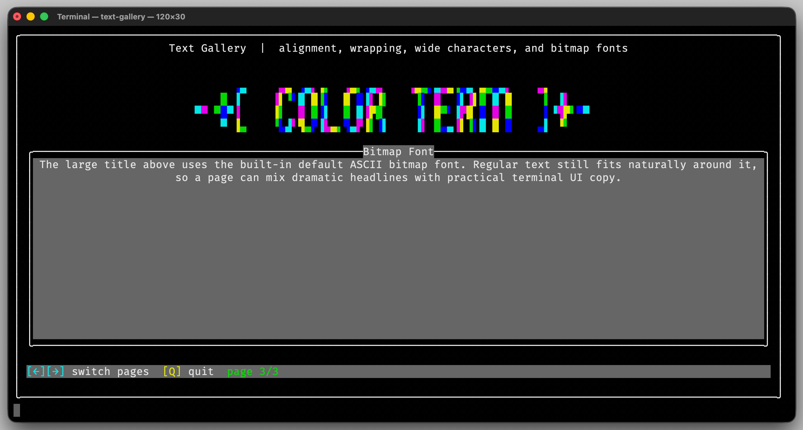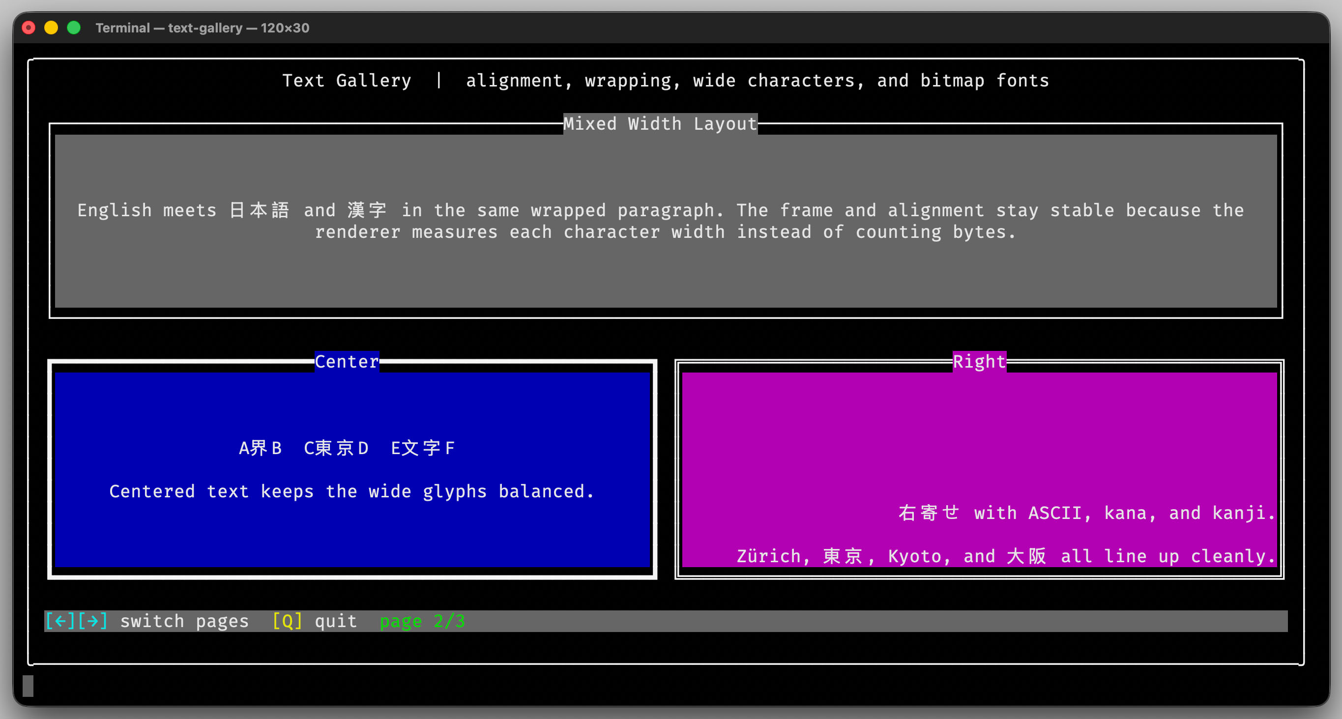 A dedicated String class makes it possible to work with colored text safely. Combined Unicode characters are grouped correctly, and each visible character can have its own foreground and background color.