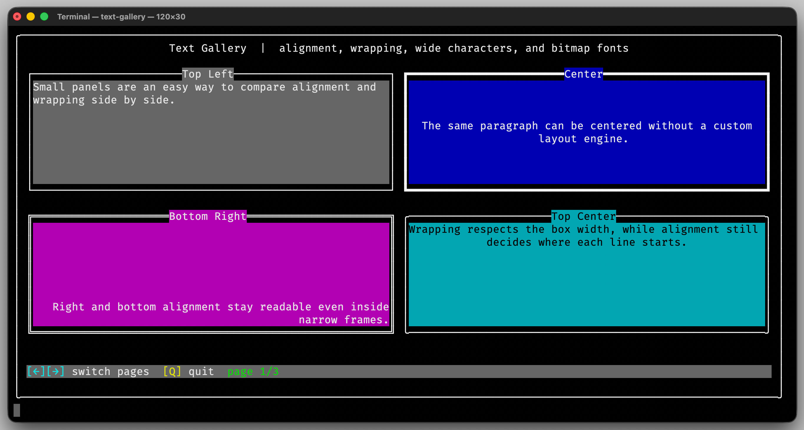It provides reliable building blocks for colorful terminal output, Unicode-aware text handling, key-based input, and geometry helpers that simplify the development of terminal user interfaces, tools, and games.